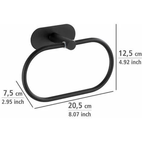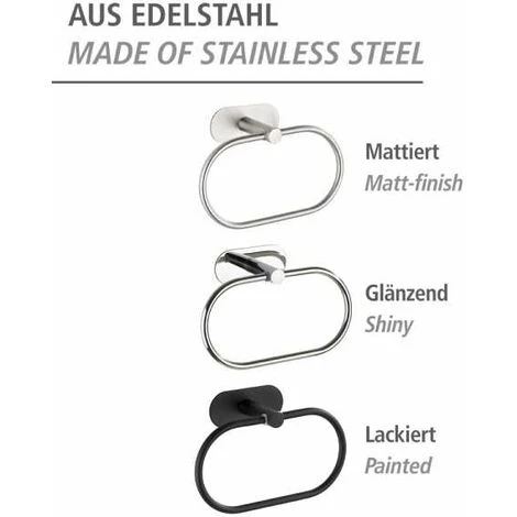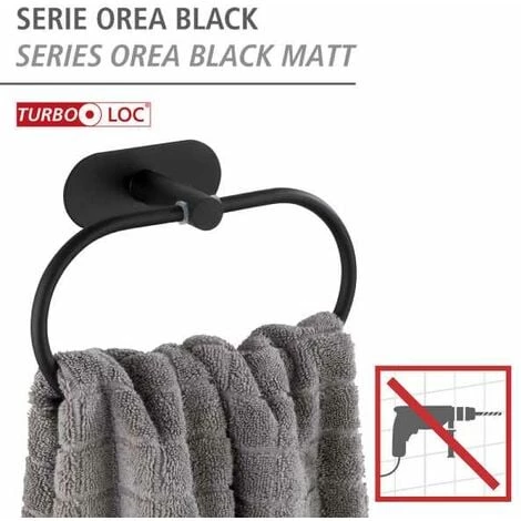 L’ingénieux système de fixation murale Turbo-Loc® de WENKO propose des accessoires de salle de bain et des tablettes de rangement décoratifs, qui se fixent facilement au mur – sans vis, sans percer de trous et sans chevilles. La fixation est un jeu d’enfants. La fixation murale Turbo-Loc® est un système de collage offrant une adhérence extrêmement forte sur toutes les surfaces lisses. Décoller simplement le film de protection du tampon autoadhésif, fixer le support à l’endroit souhaité et presser. Le tampon adhésif se décolle à nouveau sans laisser de traces. Grâce au système à tampon adhésif spécial, les ustensiles de salle de bain peuvent durablement porter des charges. Avec la série d’accessoires de salle de bain de haute qualité Orea, conférez à votre maison un nouveau style de vie. Désormais, une clarté moderne trouvera son chemin dans votre salle de bain et votre WC d’invités. Et les aides de salle de bain stylées allient fonctionnalité et qualité. La série d’articles de salle de bain est fabriquée en acier inox de qualité supérieure, qui est 100% inox. Tous les accessoires Home au coloris noir sublime sont des pièces design originales dans le style chic industriel. Le fini mat confère à votre salle de bain une esthétique parfaite. Le pratique anneau porte-serviettes Orea souplement mobile vers le haut et le bas Le porte-serviette ovale est parfaitement adapté pour y accrocher des serviettes à main, qu’il tient à tout moment à portée de main. Pour ce produit, vous bénéficiez d’une garantie de 10 ans à compter de la date d’achat. La garantie porte sur tous les vices de matériau et de fabrication qui altèrent le bon fonctionnement. Sont exclus les dommages résultant d’un maniement incorrect ou de l’usure naturelle. La garantie ne restreint aucunement vos droits à la garantie légaux. Bien d’autres articles de la série Turbo-Loc® Orea de WENKO sont disponibles pour cet accessoire. En cas de garantie, veuillez renvoyer gratuitement l‘article accompagné du ticket de caisse et convenablement emballé pour le transport à l‘adresse suivante : Wenko-Wenselaar GmbH & Co. KG · Abteilung « Retouren » Im Hülsenfeld 10 · 40721 Hilden, Allemagne [email protected]