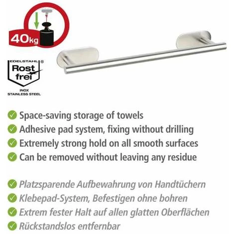 L’ingénieux système de fixation murale Turbo-Loc® de WENKO propose des accessoires de salle de bain et des tablettes de rangement décoratifs, qui se fixent facilement au mur – sans vis, sans percer de trous et sans chevilles. Fixer sans percer : la fixation murale Turbo-Loc® est un système de collage offrant une adhérence fiable sur toutes les surfaces lisses et légèrement structurées. Décoller simplement le film de protection du tampon autoadhésif, fixer le support à l’endroit souhaité et presser. Le tampon adhésif peut être utilisé immédiatement et se décolle sans laisser de traces. Grâce au système de tampon adhésif, les accessoires de salle de bain peuvent porter tous vos produits d’hygiène et cométiques. Avec la série d’accessoires de salle de bain de haute qualité Orea, conférez à votre maison un nouveau style de décoration. Les accessoires de salle de bain WENKO allient fonctionnalité et qualité. La série d’accessoires de salle de bain Orea est fabriquée en acier inox de qualité supérieure, qui est 100% inox et donc antirouille. Le fini mat confère à votre salle de bain un atout décoratif supplémentaire. La barre porte serviettes mural Orea se compose d’une barre de suspension longue de 40 cm, offrant beaucoup de place pour deux serviettes à main ou une serviette de douche. Chaque serviette peut ainsi sécher convenablement sur la barre porte-serviettes tout en étant à portée de main lorsque vous en avez besoin. Complétez l’aménagement de votre salle de bain avec les autres accessoires de la série murale sans perçage Turbo-Loc® Orea de WENKO. Pour ce porte serviette mural, vous bénéficiez d’une garantie de 10 ans à compter de la date d’achat. La garantie porte sur tous les vices de matériau et de fabrication qui altèrent le bon fonctionnement. Sont exclus les dommages résultant d’un maniement incorrect ou de l’usure naturelle. La garantie ne restreint aucunement vos droits à la garantie légaux. En cas de garantie, veuillez renvoyer gratuitement l’article accompagné du ticket de caisse et convenablement emballé pour le transport à l’adresse suivante : Wenko-Wenselaar GmbH & Co. KG – Service « Retouren » – Im Hülsenfeld 10 – 40721 Hilden [email protected]