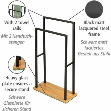 - Accessoire de salle de bain polyvalent : Le porte serviettes en acier verni mat au fini noir peut être placé selon vos besoins aussi bien dans la salle de bain que dans les WC. La construction est soutenue par une lourde plaque en verre qui, combiné au bambou de haute qualité, crée un caractère loft très tendance. Ainsi, vous avez les serviettes de bain à portée de main.