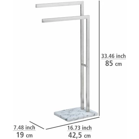 Fabriqués en acier inoxydable brillant et en polyrésine à l’aspect marbre, notre porte-serviette dégagera un style élégant et une ambiance chic dans votre salle de bains. Il est composé de deux porte-serviettes solidement ancrés sur une base d’aspect marbré. La base blanche enchante par ses fines marbrures grises sur fond blanc. Le cadre en acier inoxydable s’intègrera au meuble tant sur le plan fonctionnel que visuel. Dans la salle de bains et les toilettes, il pourra être placé librement dans la pièce. Le porte-serviettes peut également être utilisé de manière décorative comme support pour les serviettes, les écharpes, les couvertures en laine et autres textiles.