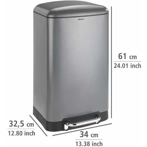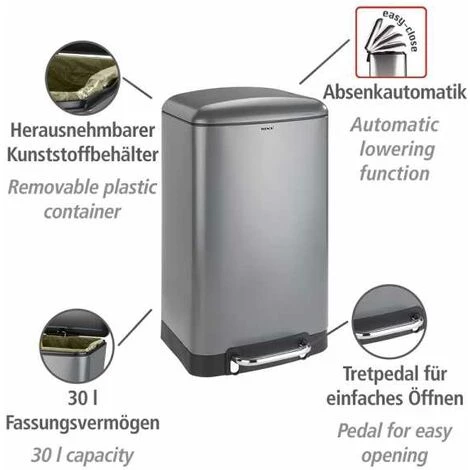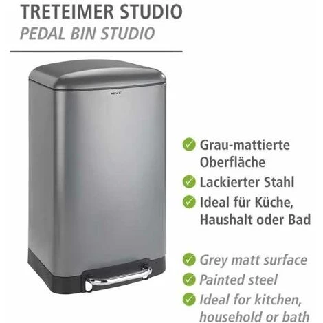 De qualité supérieure et tendance, la poubelle à pédale de la série Studio est fabriquée en acier vernis. La surface dépolie grise et la forme esthétique confèrent à la poubelle un aspect noble. Doté du système d’abaissement automatique Easy-Close de WENKO, le couvercle se ferme tout en douceur et silencieusement, sans chute bruyante. Grâce à sa fonction de pédale, la poubelle peut être ouverte sans aucune intervention manuelle et se referme automatiquement. La poubelle à pédale Studio offre une capacité de 30 litres et elle s’utilisera parfaitement en tant que poubelle dans la cuisine et l’ensemble du ménage ou dans la salle de bain. C’est notamment pourquoi l’efficace poubelle a été distinguée par la mention « Bien » par Haus und Garten (test 1/2017 Poubelles à pédale). Le jugement de Haus und Garten Test parle de lui-même : excellentes finitions et nettoyage extrêmement facile. Vous pouvez ainsi être certain qu’en achetant la poubelle à pédale Studio de WENKO, vous acquérez un produit testé d’excellente qualité.