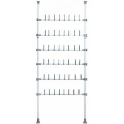 Avec le système télescopique variable Herkules de WENKO, le rêve d’un dressing accessible pourra enfin se réaliser dans presque toutes les pièces. La pratique étagère télescopique Herkules Shoes est parfaitement adaptée comme élément de la gamme Herkules Mix & Match, avec laquelle vous pourrez agrandir ou réaménager votre propre dressing accessible. Beaucoup de place pour les chaussures pour un encombrement minimal : La pratique étagère à chaussures apporte une vue d’ensemble bien ordonnée dans le corridor, le dressing ou encore l’ensemble du ménage. Grâce à la possibilité de réglage en hauteur, l’astucieux porte-chaussures peut être adapté à une grande variété de pièces. Réglable individuellement, ce système d’ordre se coince simplement, sans outils, entre le plafond et le sol à l’aide de ses barres télescopiques réglables en hauteur (165-300 cm), et offre sur six niveaux un espace généreux pour 48 paires de chaussures. L’astucieuse étagère télescopique vous évite les tracas de la recherche et, grâce à ses barres métalliques revêtues par poudrage, elle vous offre une très bonne stabilité dans une qualité particulièrement lourde.