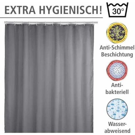 La nouveauté mondiale de ce rideau particulier est le sensationnel « effet anti-moisissure » ! Ainsi, finie l’époque des rideaux de douche avec des traces de moisissure. Esthétique et efficace, cet accessoire est en outre doté d’un revêtement antibactérien. Grâce à cette innovation, Wenko fait entrer hygiène et design dans la salle de bain. D’une largeur de 180 cm, le rideau de douche classique en gris moderne et discret est parfaitement adapté aussi bien pour les douches que les baignoires. Le rideau de douche aux finitions haut de gamme est fabriqué en polyester particulièrement robuste. La matière est hydrofuge grâce à l’ennoblissement de sa surface. Il est agréé TÜV, facile à entretenir et lavable à 30 °C. L’ourlet supérieur est doté d’un rebord à trous renforcé et d’oeillets métalliques inox. Un ruban alourdisseur en caoutchouc écologique (au lieu d’une chaîne en plomb) à l’extrémité du bas donne au rideau sa forme. La livraison comprend 12 anneaux en plastique blanc pour rideau de douche.l: 200 cm x L: 180 cm