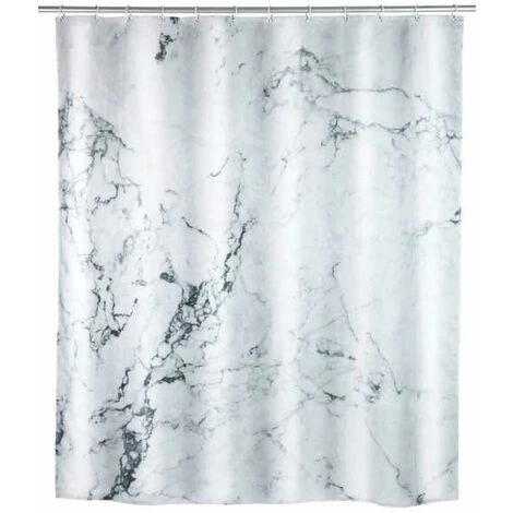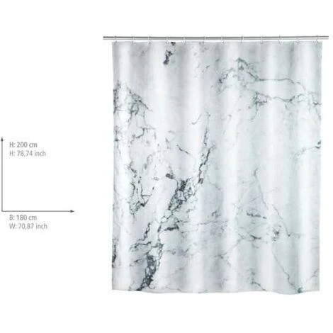 Le rideau de douche Onyx au somptueux design de marbre offre un changement réussi dans le quotidien monotone en salle de bain. D’une largeur de 180 cm et une hauteur de 200 cm, l’ingénieux rideau de douche est adapté aussi bien pour les douches que pour les baignoires. Le rideau de douche aux finitions haut de gamme est fabriqué en polyester particulièrement robuste. La matière est hydrofuge grâce à l’ennoblissement de sa surface. Il est facile à entretenir et lavable à 30 °C. L’ourlet supérieur est doté d’un rebord à trous renforcé et d’oeillets métalliques inox. Un ruban alourdisseur en caoutchouc écologique (au lieu du plomb) à l’extrémité du bas donne au rideau sa forme. La livraison comprend 12 anneaux pour rideau de douche en matière plastique blanche. Le rideau hors du commun se combinera particulièrement bien avec les accessoires assortis, tels que, par ex., la poubelle cosmétique et l’abattant WC. Tous les ustensiles de salle de bain ont un effet noble et promettent des heures relaxantes dans la salle de bain.