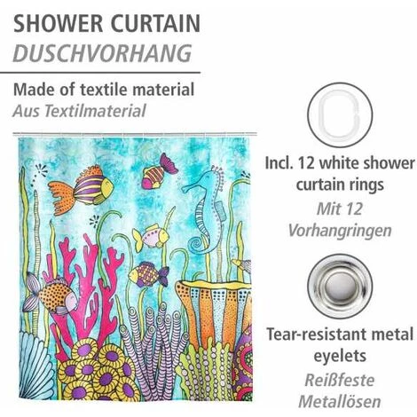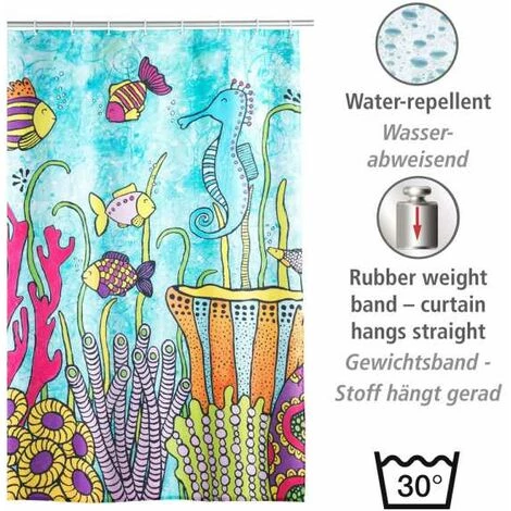 - Un accessoire esthétique et coloré : Le rideau de douche Rollin’Art Ocean Life de WENKO représente en différentes couleurs la diversité animale et végétale d’un monde sous-marin multicolore. L’océan bleu clair et ses habitants, petits et grands, font de ce rideau un élément phare dans la salle de bain et les toilettes d’invités.