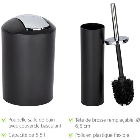 Les accessoires de salle de bain modernes au design subtil Calvo conviennent parfaitement comme équipement complet dans chaque salle de bains ou WC. Les quatre accessoires indispensables de salle de bain allient l’utile et l’agréable grâce à leur design et leur fonctionnalité. Le set d’accessoire de salle de bain Calvo est décliné en deux couleurs : noir et blanc. Avec un liséré chromé, les accessoires de salle de bain s’adaptent à tous les styles de salle de bain et créent une décoration harmonieuse. Fabriqués en plastique robuste avec surface mate, tous ces accessoires de salle de bain sont durables et faciles à nettoyer. Les accessoires s’accordent parfaitement entre eux en matière de style, et produisent ainsi un bel effet dans les salles de bain. Le set d’accessoires de salle de bain contient : une poubelle salle de bain Calvo : Capacité : 6.5L, ø19.5 x L30cm un gobelet brosse à dent Calvo : ø6.5 cm x L13 cm une brosse WC Calvo : ø7.5cm x L36 cm un distributeur de savon liquide Calvo : ø6.5cm x L17.5 cm WENKO, « la meilleure idée » ! La marque WENKO est un succès depuis la fin des années 1950. WENKO est une référence en matière de produits pour salle de bains, cuisine, buanderie et les WC. Concevoir selon « la meilleure idée » : en suivant cette philosophie, WENKO fabrique des produits innovants au design créatif, qui témoignent de l’esprit inventif de ses équipes. Elle met aussi la satisfaction des clients au centre de ses préoccupations, et s’efforce de proposer le meilleur rapport qualité-prix. La société et ses produits ont obtenu de nombreuses distinctions lors d’événements. À votre tour, laissez-vous inspirer par de beaux accessoires et trouvez des idées innovantes pour votre habitat. Découvrez l’univers de WENKO !
