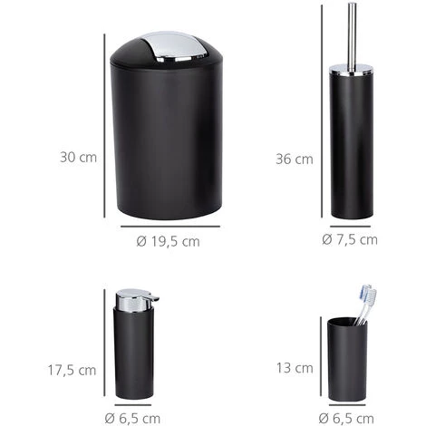 - ETENDUE DE LA LIVRAISON : poubelle salle de bain Calvo : Capacité : 6.5L, ø19.5 x L30cm ; gobelet brosse à dent Calvo : ø6.5 cm x L13 cm ; brosse WC Calvo : ø7.5cm x L36 cm ; distributeur de savon liquide Calvo : ø6.5cm x L17.5 cm