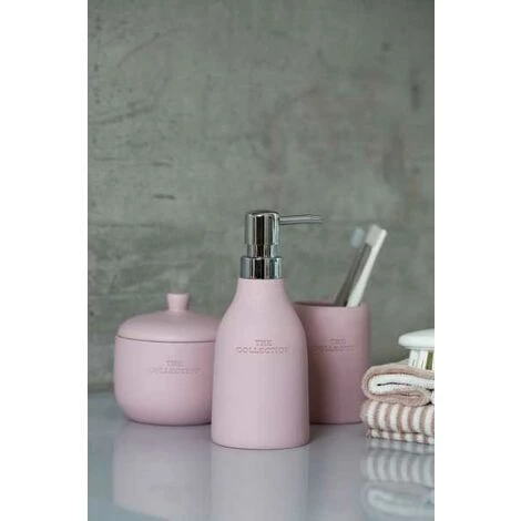 - Etendue de la livraison : 1 x distributeur de savon liquide The Collection de WENKO, distributeur avec pompe en polyrésine rose mat, avec inscription gravée, capacité de remplissage d’environ 330 ml, dimensions (L x P x H) : 8 x 18,5 x 9 cm, 1 x gobelet brosse à dents The Collection de WENKO, gobelet sale de bain en polyrésine rose mat, avec inscription gravée, dimensions (L x P x H) : Ø 8 x 10 cm.