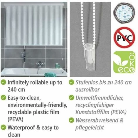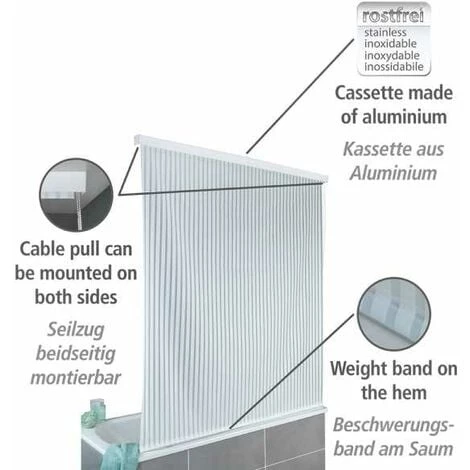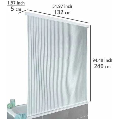 WENKO vous propose l’alternative moderne au rideau de douche : le store de douche de haute qualité est idéal pour la douche ou la baignoire et crée en un tour de main une atmosphère design dans la salle de bain. Le store à séchage rapide séduit par sa fonctionnalité ingénieuse et son design particulièrement esthétique. Avec son dessin à rayures tendance en blanc classique, le rideau de douche est un véritable élément décoratif. Il est réalisé en matière plastique recyclable (PEVA) facile d’entretien, respectueux de l’environnement et absolument imperméable à l’eau. Le rideau de douche a des dimensions de 128 x 240 cm. Le montage est facile comme un jeu d’enfants : Le store de douche et de baignoire se monte au plafond avec son coffre de rangement. Il peut ainsi être déroulé en continu jusqu’à sa longueur totale de 240 cm à l’aide de la cordelette de traction à chaîne de billes fixée sur le côté. Après la douche ou le bain, laisser sécher tout simplement et une fois sec l’enrouler à nouveau – absolument pratique, moderne et peu encombrant. Le boîtier verni blanc du coffre est fabriqué en aluminium de qualité supérieure et absolument inoxydable. Des vis et des chevilles pour la fixation sont incluses dans la livraison.