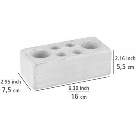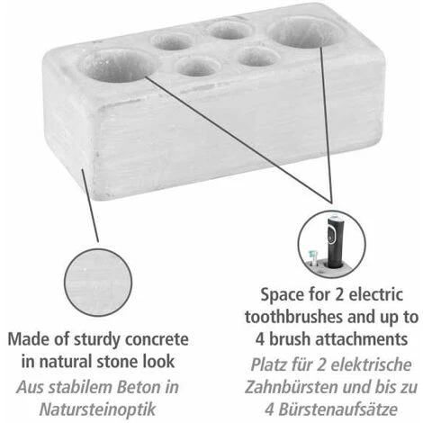 - Contenu de la livraison : Support pour brosses à dents Villena de WENKO en gris, idéal pour brosses à dents électriques à tête rotative et pour la brosse à dents sonique, de la place pour votre propre brosse à dents à celle d’un membre de votre famille, d’un ami ou du/de la conjoint/e, 4 trous pour têtes à brosses interchangeables, fabriqué en béton résistant, dimensions : (l x h x p) 6 x 5,5 x 7,5 cm.