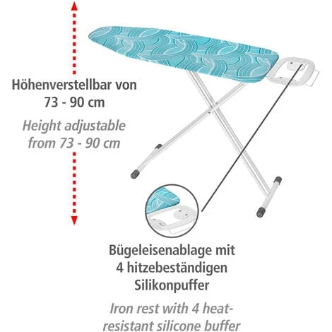 La table à repasser Advance de WENKO facilite le repassage. Dans la position assise ou debout, le repassage se transforme en un véritable jeu d’enfants avec la table à repasser Advance. Grâce à la possibilité de réglage en hauteur de 73 cm à 90 cm, la planche à repasser s’adapte à votre position de repassage et vous permettra ainsi de ménager votre dos. La table de repassage est fabriquée en métal peint par poudrage de couleur blanche, elle est ainsi protégée contre la rouille. Le tube rond extra-épais de Ø 22/35 mm lui confère une tenue optimale. Le bâti à pied en T astucieux garantit en outre sa stabilité. La housse moderne avec motif bleu frais est fabriquée en coton, est dotée d’un rembourrage alvéolaire extra-épais de 8 mm. Ce rembourrage permet un repassage en douceur et sans plis. Bien évidemment, la housse de planche à repasser est également appropriée pour le repassage avec centrale vapeur. Avec une généreuse surface de repassage de 120 x 42 cm, elle permet de repasser sans effort le linge du quotidien. Lorsqu’elle n’est pas utilisée, la planche de repassage peut être repliée sans effort à des dimensions peu encombrantes. Dimensions à l’état replié : 164 x 42 x 6 cm Le repose-fer offre un emplacement esthétique et fiable pour tous les fers à repasser de taille standard (taille du repose-fer : 30 x 18 cm, creux dans le repose-fer : 15,5 x 13 cm). Le repose-fer est équipé de quatre tampons en silicone antidérapants résistants à la chaleur, qui ménagent la surface de repassage du fer à repasser. Étant donné que la longévité et la durabilité de nos produits nous tiennent à coeur, nous utilisons des matériaux de haute qualité. La planche à repasser Advance a été fabriquée en Europe, si bien que les distances de transport sont courtes et que les émissions de CO2 sont réduites à un minimum.