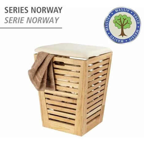 Le design purement scandinave séduit par son côté convivial et chaleureux. Aménagez votre espace habitable dans le style Hygge avec la série en bois naturel clair Norway. Le rayonnement chaud du bois naturel, les formes sobres et les possibilités d’utilisation de la série de meubles Norway font d’elle une excellente combinaison de design et de fonctionnalité pour votre intérieur. La série de meubles Norway aux finitions haut de gamme, en bois de noyer massif, est ennoblie à l’huile de bois naturelle. Le coffre à linge bois Norway offre un vaste espace de rangement sous la surface de siège pour le linge sale. Dans le tabouret panier à linge, votre linge trouvera un volume de stockage de 55 litres en attendant le prochain lavage. De plus le panier à linge bois est équipé d’un couvercle pour que le linge reste à sa place et et cacher des regards indiscrets . Rembourrée, sa surface de siège généreuse est une invitation permanente à prendre place et peut donc être utilisée également en tant que tabouret de salle de bain. De même, le tabouret panier à linge est également approprié en tant que support de rangement pour des serviettes, vêtements ou plantes vertes. Que vous placiez le tabouret panier à linge bois, dans la salle de bain, la chambre, le couloir ou encore la buanderie, le coffre à linge bois sera un atout design de rangement.