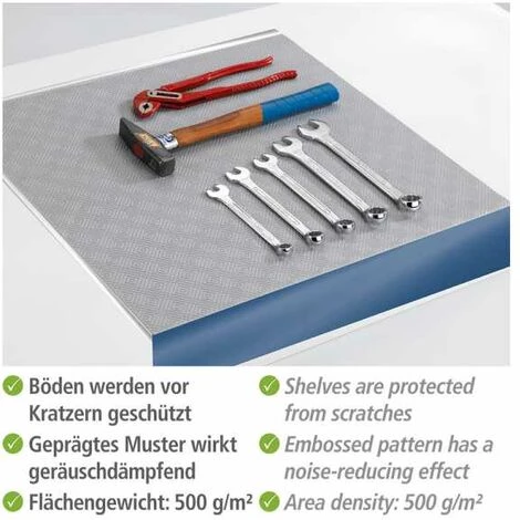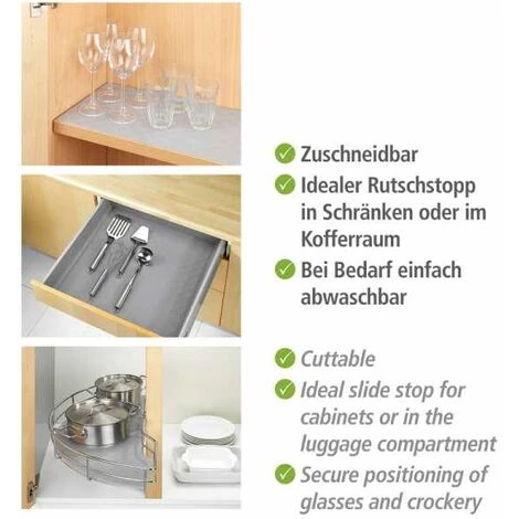 L’antidérapant idéal pour toutes les armoires, tous les tiroirs et tout ce qui ne devrait pas glisser : l’ingénieux tapis antidérapant de WENKO. L’antidérapant garantit un positionnement fiable des verres, de la vaisselles, des casseroles, des couverts et des petits articles. Tout peut être rangé de manière fiable et fonctionnelle et le sol reste à l’abri des éraflures peu esthétiques. Le confortable antidérapant confère également une meilleure stabilité aux petites pièces dans les corbeilles en filaire, sur les étagères ainsi que dans les boîtes à outils lourdes dans la malle arrière du véhicule. Le tapis d’entretien facile peut être découpé à n’importe quelles longueur et largeur et, par son design marqué, place des accents en gris tendance. Il est facilement lavable en cas de besoin. Le tapis antidérapant est fabriqué en plastique robuste d’un poids surfacique de 500 g/m².