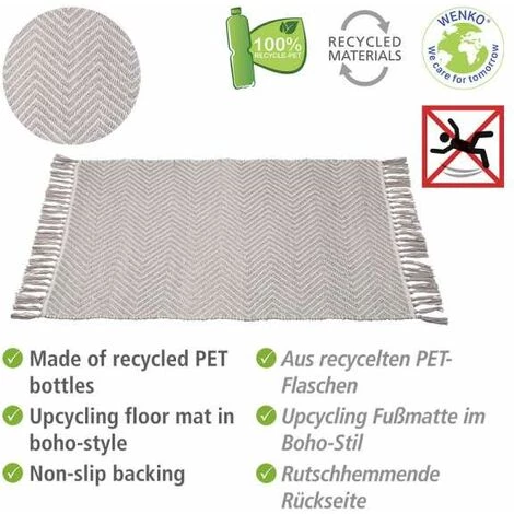 Une vie plus durable commence déjà à la maison. Par exemple, en réduisant sa consommation d’eau et d’énergie, ou en évitant les déchets plastiques. Vous pouvez également miser sur des matériaux durables lorsque vous décorez votre maison, sans pour autant renoncer à une esthétique moderne. Avec la natte de bain Gata de WENKO, vous faites entrer un élément décoratif valorisant et durable dans votre salle de bain. La natte de bain Gata est à 100 % en polyester. Pour fabriquer le tapis de bain, environ 18 bouteilles PET recyclés ont été utilisés. De cette manière, les bouteilles en plastique bénéficient d’une seconde vie dans votre salle de bain et contribuent au facteur de durabilité. Le tapis de bain sait faire tout ce qu’un tapis doit savoir faire : Le tapis de bain Gata vous accueille après une douche rafraichissante, un bain relaxant ou maintient vos pieds au chaud pendant le lavage des dents. Pour garantir une tenue sûre, le dessous du tapis de bain est équipé d’un traitement antidérapant. Il peut être placé sans problème sur des carrelages lisses. Le tapis de bain Gata est la preuve évidente qu’un produit durable puisse également être esthétique. Le tapis offre un style tendance ethno. Le jeu de motifs géométriques est typique pour cette tendance qui réunit les formes et styles du monde entier. La natte de bain durable séduit par son motif symétrique en zigzag. Les franges sur les côtes courts apportent la touche finale au design. Le design discret de couleur gris clair et blanc rend le tapis très polyvalent sur le plan esthétique qui s’associe parfaitement avec un grand nombre de concepts d’aménagement. Avec ses dimensions (l x p) de : 50 x 80, le textile de bain est adapté pour servir de tapis de bain devant la baignoire ou devant le lavabo, de tapis de tapis de douche ou même d’élément décoratif dans les autres espaces. Évidemment, la natte de bain tendance peut également être utilisée dans d’autres pièces pour apporter une touche esthétique au sol. Le tapis de bain est lavable à 40°C et adapté pour le chauffage au sol. Le tapis de bain Gata est le bon accessoire pour ceux qui souhaitent relier le facteur durable avec le design. Si vous recherchez un autre motif ou une autre couleur, vous pourriez trouver votre bonheur chez WENKO. L’assortiment comprend encore de nombreux autres tapis de bain à base de matériaux recyclés et durables.