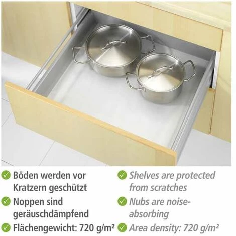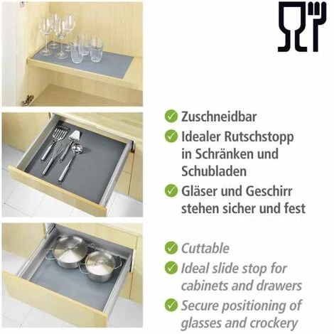 Le tapis antidérapant extra-épais est l’antidérapant idéal pour toutes les armoires et tous les tiroirs. Le tapis de tiroir antidérapant garantit une stabilité fiable des verres, des casseroles et des petits accessoires de cuisine. Tout peut être rangé de manière fiable et fonctionnelle. Le tapis a en outre un effet insonorisant et facilite le nettoyage de vos placards. Il peut être découpé à toutes les longueurs et largeurs souhaitées et, par sa couleur grise, il apporte des notes tendances à chaque tiroir. Le tapis antidérapant à picots est fabriqué en matière plastique robuste et particulièrement épais.
