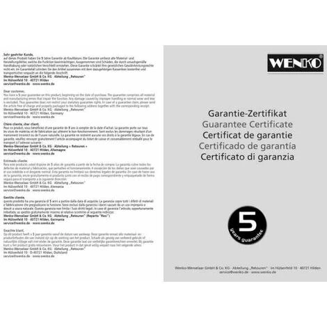 Le système de fixation murale Turbo-Loc® offre des accessoires et des tablettes décoratifs, qui se fixent facilement au mur – sans vis, sans percer et sans chevilles. La fixation est un jeu d’enfants. La fixation murale Turbo-Loc® est un système de collage avec une fixation extrêmement rigide sur toutes les surfaces lisses. Décoller simplement le film de protection du tampon autoadhésif, fixer le support à l’endroit souhaité et presser. Ensuite, il ne reste plus qu’à accrocher l’accessoire. Le tampon adhésif s’enlève à nouveau sans laisser de traces. Grâce au système de tampon adhésif spécial, les crochets de fixation peuvent chacun résister à une force de traction atteignant 40 kg. Décoratif, le crochet mural Turbo-Loc® Pisa présente un design très noble et il est fabriqué en zinc moulé sous pression, inox et brillant. Évidemment, le crochet mural Turbo-Loc® bénéficie d’une garantie de 5 ans. La livraison comprend 4 crochets. Pour ce produit, vous bénéficiez d‘une garantie de 5 ans à compter de la date d‘achat. La garantie porte sur tous les vices de matériau et de fabrication qui altèrent le bon fonctionnement. Sont exclus les dommages résultant d‘un maniement incorrect ou de l‘usure naturelle. La garantie ne restreint aucune vos droits à la garantie légaux. En cas de garantie, veuillez renvoyer gratuitement l‘article accompagné du ticket de caisse et convenablement emballé pour le transport à l‘adresse suivante : Wenko-Wenselaar GmbH & Co. KG · Abteilung « Retouren » Im Hülsenfeld 10 · 40721 Hilden, Allemagne [email protected]