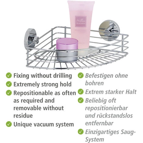 L’étagère d’angle de douche Vacuum-Loc Bari, peu encombrante, permet de garder les articles de douche toujours à portée de main. L’étagère d’angle de douche se fixe sans perçage grâce à la technologie innovante Vacuum-Loc : Ce système unique permet de fixer les accessoires rapidement, facilement et en toute sécurité sur toutes les surfaces imperméables à l’air et légèrement irrégulières. Le système innovant Vacuum-Loc se compose d’une pompe et de languettes de fixation ; il n’est pas nécessaire de percer ou de visser, ni d’utiliser des ventouses. En aspirant l’air à l’aide de la pompe fournie, un vide est créé dans le Loc et les adaptateurs avec l’accessoire peuvent être chargés immédiatement. Les Vacuum-Locs® Ø 6 cm peuvent être repositionnés aussi souvent que souhaité et retirés sans laisser de résidus. La distance par rapport à l’angle est de 3,5 cm minimum et de 18 cm maximum. La hauteur du panier est de 6 cm. Le système Vacuum-Loc est protégé par un brevet européen et garantit un maintien sûr. Chaque éclisse de fixation peut être chargée en permanence d’une force de traction allant jusqu’à 33 kg. Il s’agit de la force qui tire sur le point d’ancrage dans une direction horizontale, c’est-à-dire vers le générateur de force. Vous bénéficiez d’une garantie de 3 ans sur ce produit à compter de la date d’achat. La garantie couvre tous les défauts de matériel et de fabrication qui affectent la fonction. Les dommages causés par une manipulation inappropriée ou l’usure naturelle sont exclus. Cette garantie ne limite pas vos droits de garantie légale. En cas de réclamation au titre de la garantie, veuillez envoyer l’article, accompagné du reçu correspondant, gratuitement et dans un emballage sûr pour le transport, à l’adresse suivante : Wenko-Wenselaar GmbH & Co. KG – Département « Retours » Im Hülsenfeld 10 – 40721 Hilden [email protected]